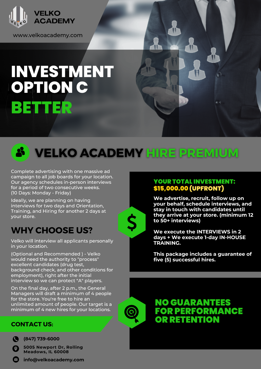 We advertise, recruit, follow up on your behalf, schedule interviews, and stay in touch with candidates until they arrive at your store. (minimum 12 to 50+ interviews)